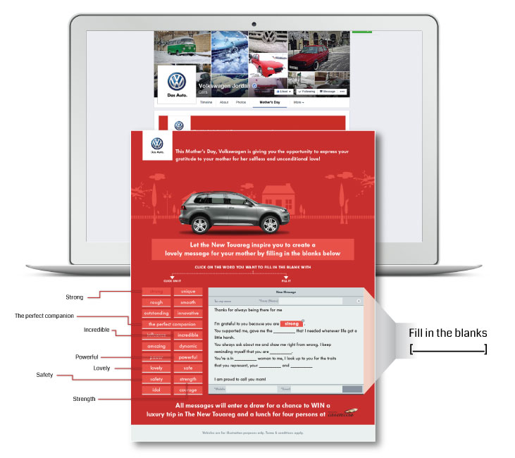 Sending out a greeting card to their mothers, users were asked to use certain keywords to describe the key qualities found in their mothers, which are also found in Touareg; always as safe and as reliable.